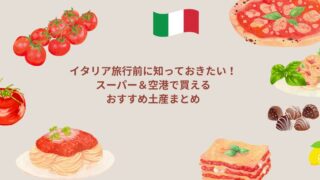 旅のこと イタリア旅行前に知っておきたい!スーパー&空港で買えるおすすめ土産まとめ 今回は旅行準備編として、イタリアで手軽に買えるばらまき用土産や自分用土産、スーパーで手に入るインスタント食品をまとめました。現地でのお買い物計画に役立つガイドです。 2025.11.12 旅のこと