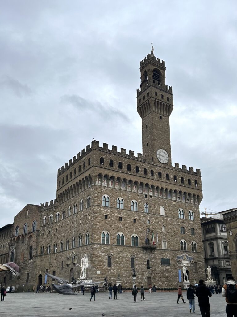 - ヴェッキオ宮殿(市庁舎)がそびえ立つ迫力ある空間