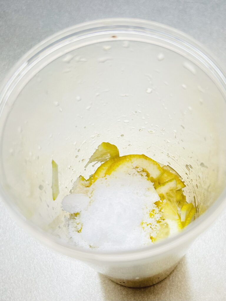 切ったレモンの重さを量り、その10%の塩を用意します。 - 専用容器に入れる