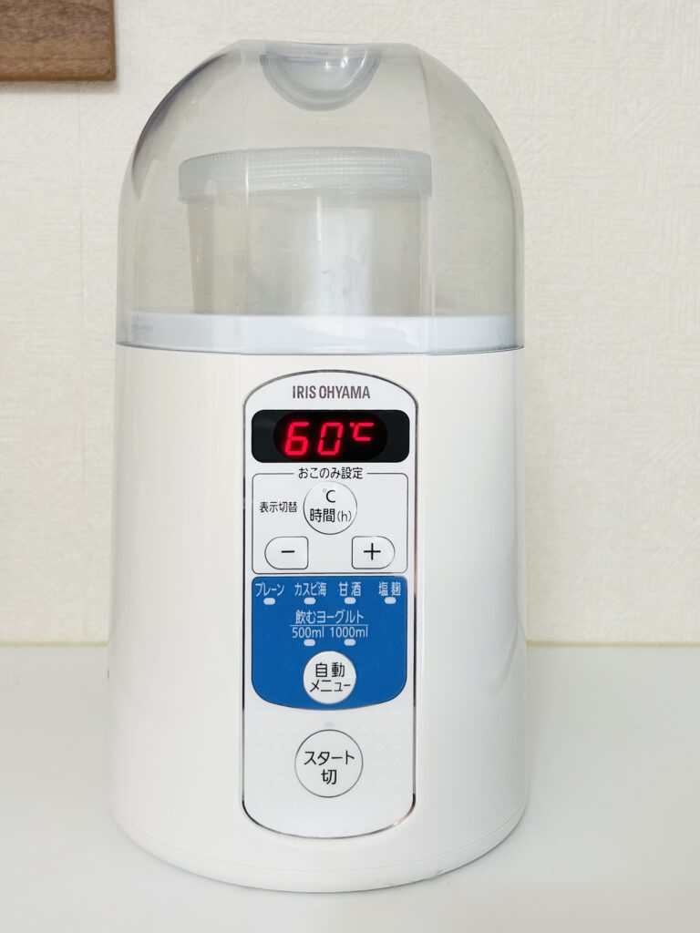 アイリスオーヤマのヨーグルトメーカーの手動モード「60℃・10時間」に設定し、スタートします。 - 途中で混ぜる