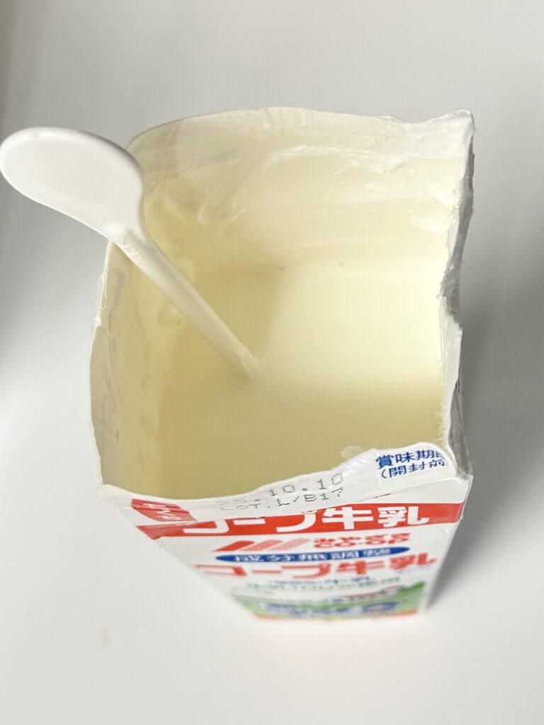 - 牛乳パックにヨーグルトを加えてよく混ぜる