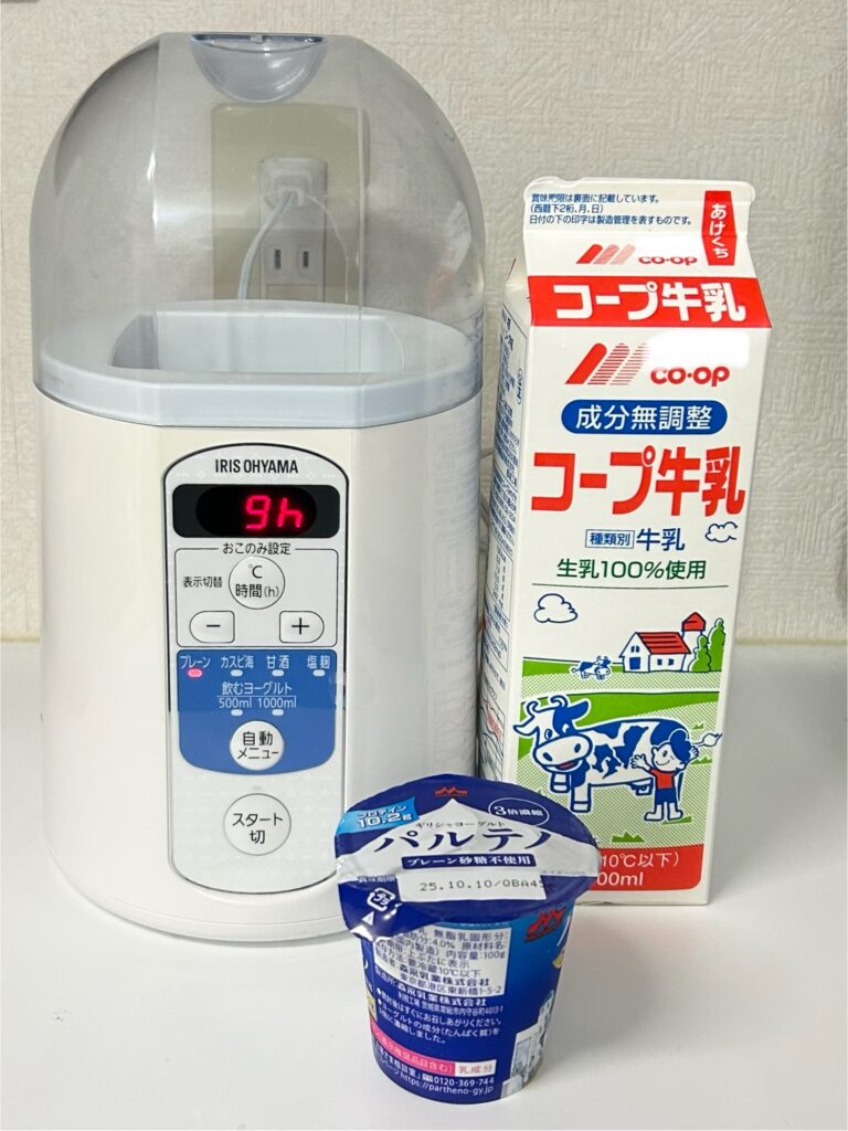 ヨーグルトメーカーがあれば、牛乳と少量の種菌(市販ヨーグルト)をセットするだけで、手軽に作れます。