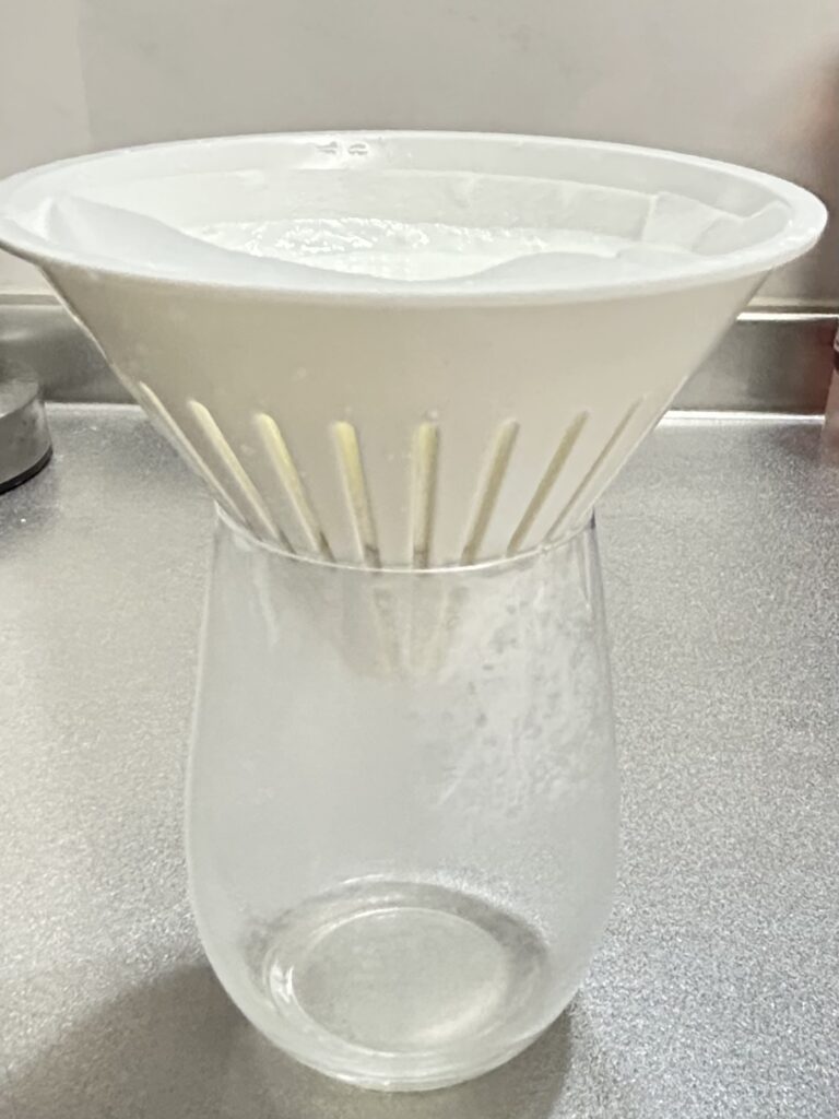 コーヒーフィルターまたはキッチンペーパーを広げてヨーグルトを入れ、ホエーが落ちてこなくなるまで水切りする。