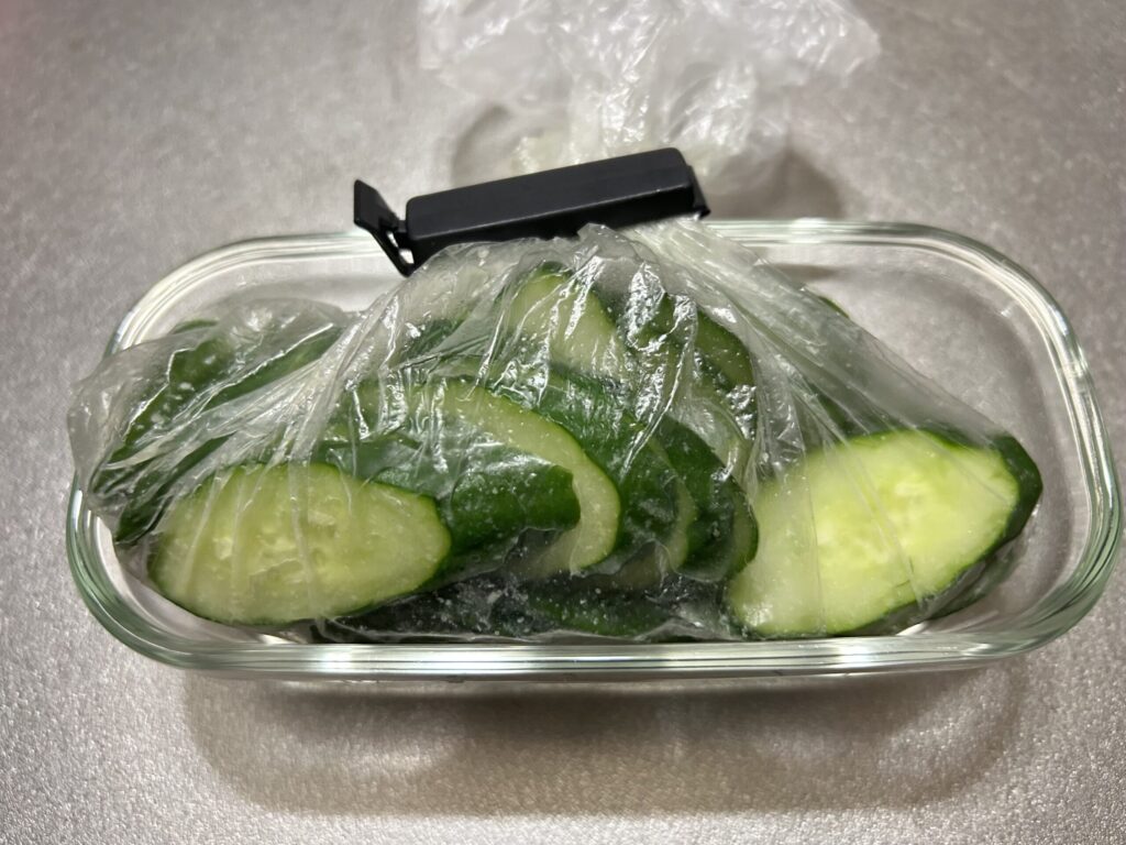 2. ポリ袋にきゅうりと塩麹を入れ、よくもみ込む。
